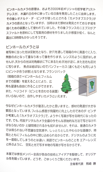 被写体に当った光は反射光となり、針穴を通して暗箱の中に真直ぐに入り、無数の点となって重なりあって像を作ります。レンズのように屈折はしませんが、天からの光は対角線状に下に来るため天地が逆に、また左右も反対に写ります。 焦点は結ばないのでパンフォーカス(遠くも近くも同じようにピントが合う状態)となります,フランジバック (暗箱の深さ=ピンホールとフィルムまでの距離)を変えることにより、広角も望遠も自由に作ることができます。また、ヘリコイド(ピンとを合わせる装置)がいらないので、自作しやすいカメラといえます。 今なぜピンホールカメラが復活したかと言いますと、感材の発達が大きな要因となっています。フィルム感度が飛躍的に向上したのであのダ・ピンチが考案した「カメラオブスクラ」で、ようやく写真が写せる時代になったのです。でも、何故デジタルカメラ全盛の今そんな原始的な方法で写さなければならないのかと疑問視されるかも知れませんが、それは、普通のカメラでは得られない不思議な空気感や、しっとりとしたやわらかな画像が、時間とともにフィルムの中に閉じ込められるからです。デジタルのように光を一度殺してしまうのとは違い、英語でピンホールのことをエアーレンズと呼ぶように、空気と光で写す本物の写真が写せるからです。 本展では参加メンバー全員が各自の技術とアイデアを駆使して、オリジナル性を競っています。どうぞ、ごゆっくりご覧くださいませ。